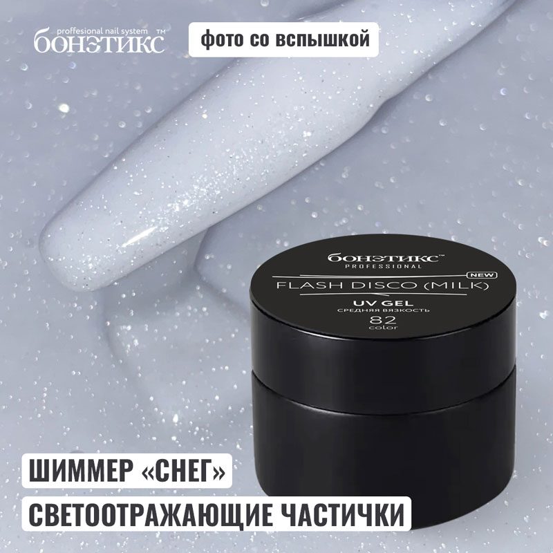 Новинка!☄️ Экспериментальный гель №82 Гель Бонэтикс™ Flash Disco MILK (Shine) - молочный жёсткий UV/LED-гель средней вязкости со светоотражающими частичками и серебристым шиммером, который мерцает, как чистый сибирский снег. За счёт плотности светоотражающих частиц у этого молочного геля есть чуть сероватый оттенок.